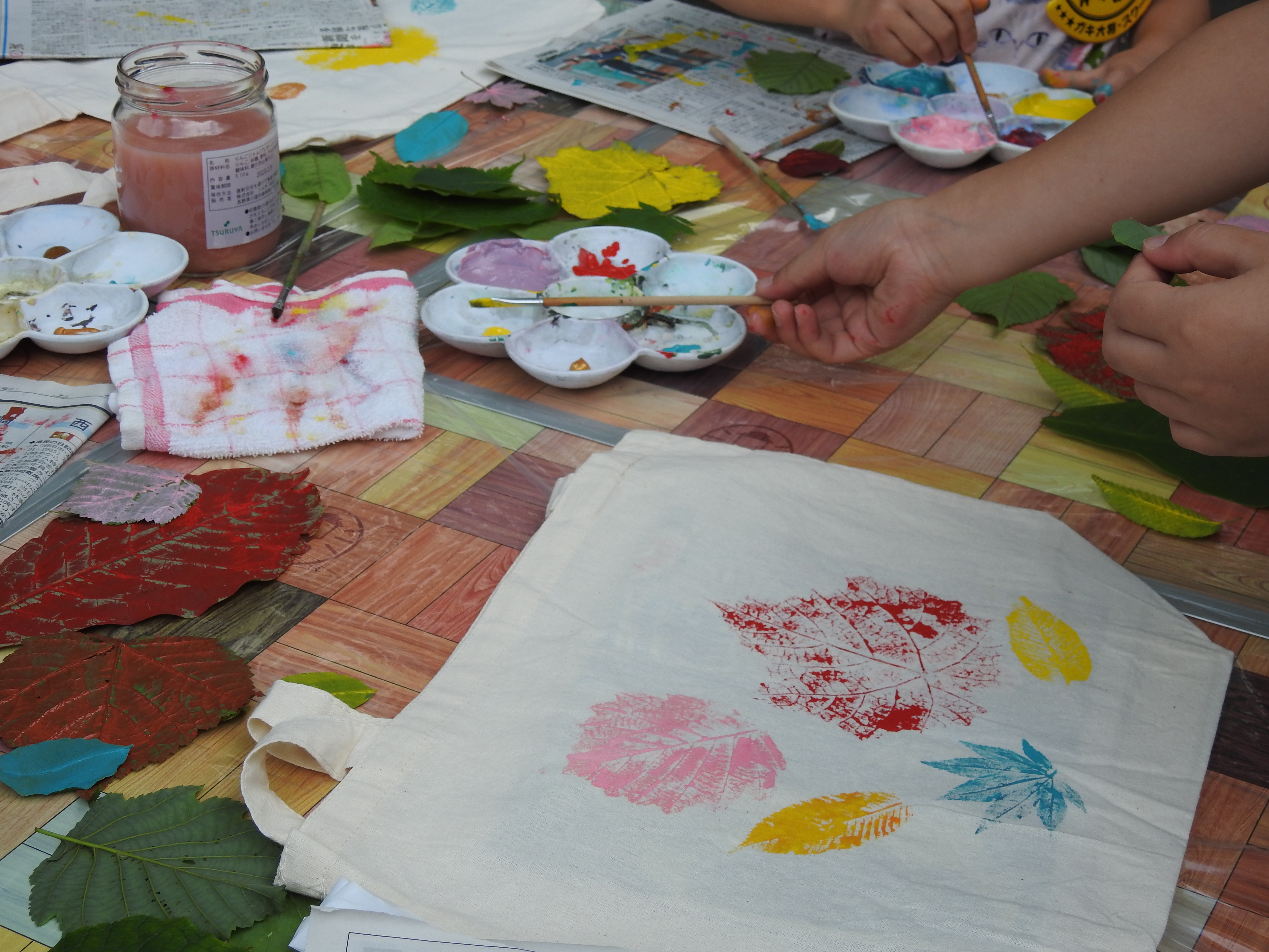 葉っぱにインクを塗って、オリジナルトートバックを制作